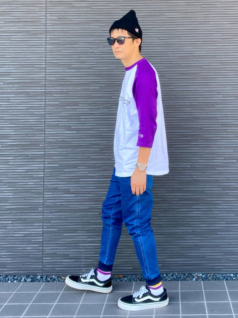 Championスタイル✨✨ ラグランTシャツとラインソックスの 紫がポイント🟣🟣 今日も秋晴れ、いい天気😎 大谷選手の偉業を見たいと早起きしましたが、ベーブルース以来103年ぶり2桁勝利2桁ホームランは次回にお預け〜残念😖