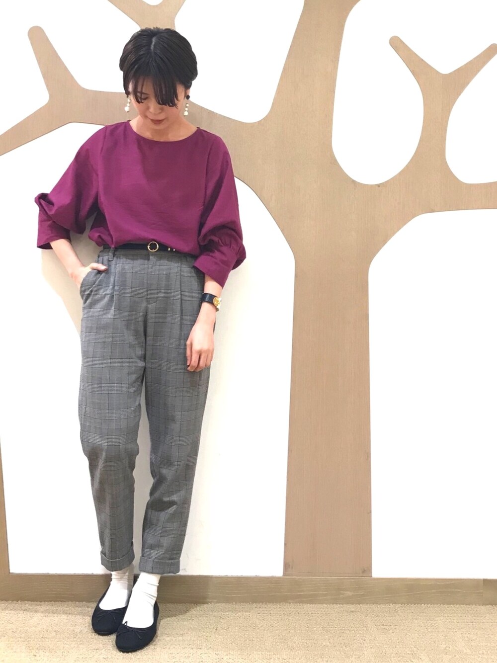 こんにちは! 閲覧ありがとうございます( ˆoˆ ) 秋の新作のチェックパンツと、 トレンドのピンクパープルのブラウスを 合わせたシンプルコーデ パンツはテーパードタイプで、 スッキリはけるおすすめアイテムです♡ ソックスとバレエシューズを合わせて マニッシュな雰囲気に♪