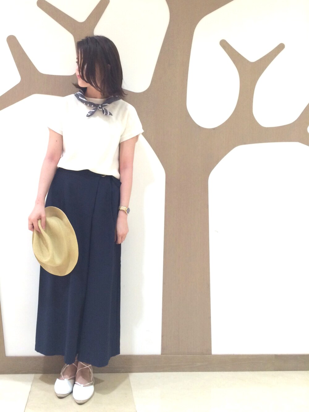 スリット入りニットをワイドパンツに合わせたシンプルコーデ バンダナとハットでさりげなくコーデを格上げ ちょっぴりマリンスタイルに仕上げました