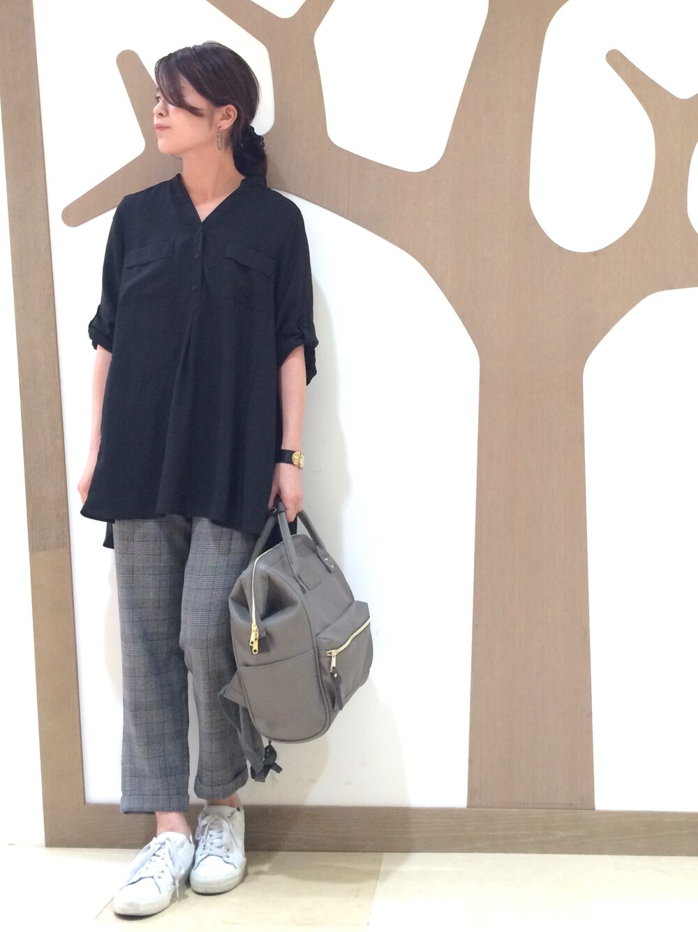 閲覧、いいねありがとうございます♡ チェックパンツがポイントの秋のモノトーンスタイルです(^o^) パンツはテーパードシルエットなので、ゆったりめのチュニックシャツと合わせてもバランス◎ スッキリ見えるのに腰まわりゆったり楽ちんな優秀アイテムです!!
