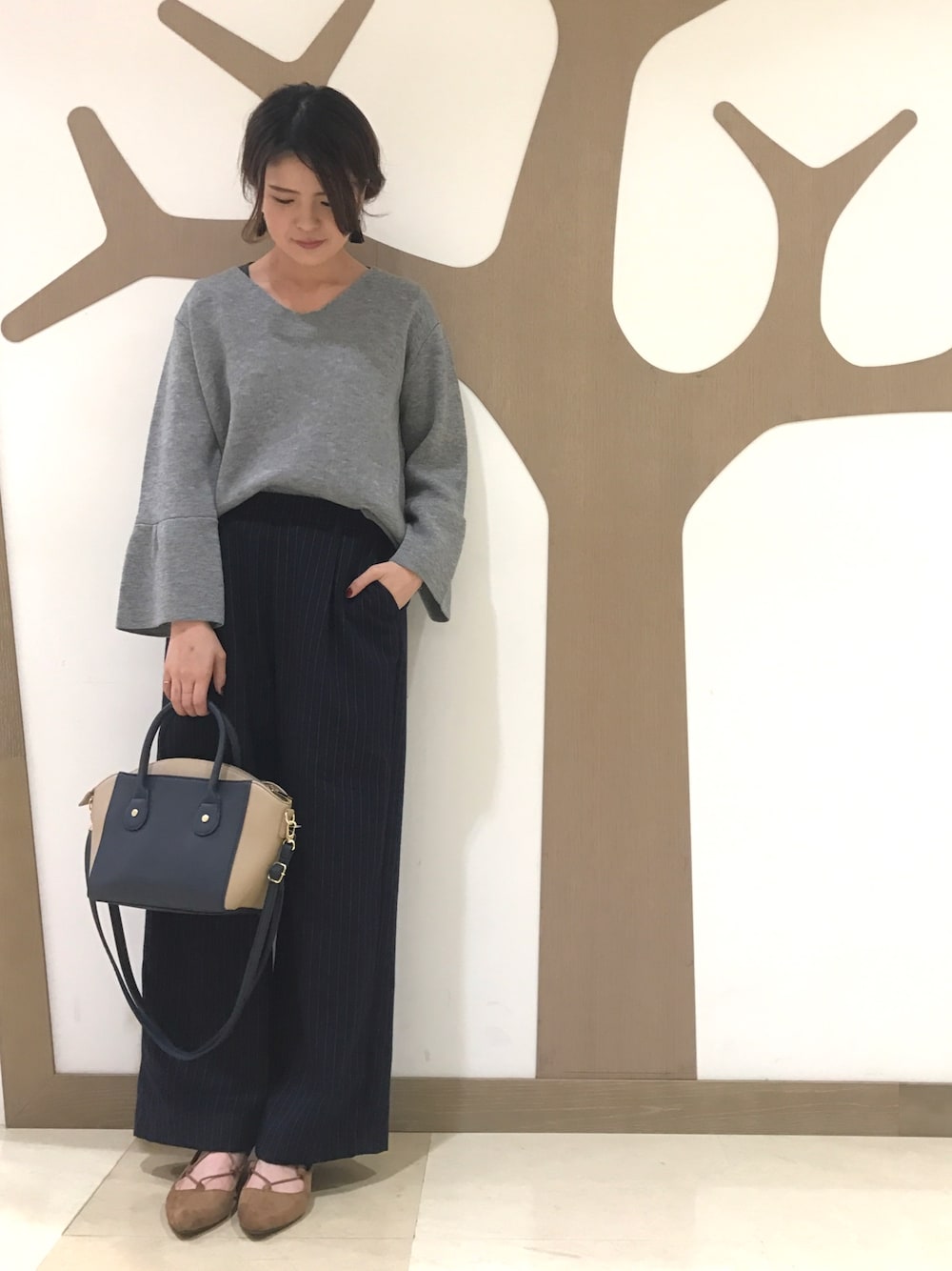 閲覧、いいねありがとうございます(>_<)♡ Vネック&フレア袖がトレンド感◎のトップス 首回りもすっきり見え、女性らしく着こなせます ピンストライプのワイドパンツに合わせ、小物使いでキレイスタイリングにしてみました(^^)♪
