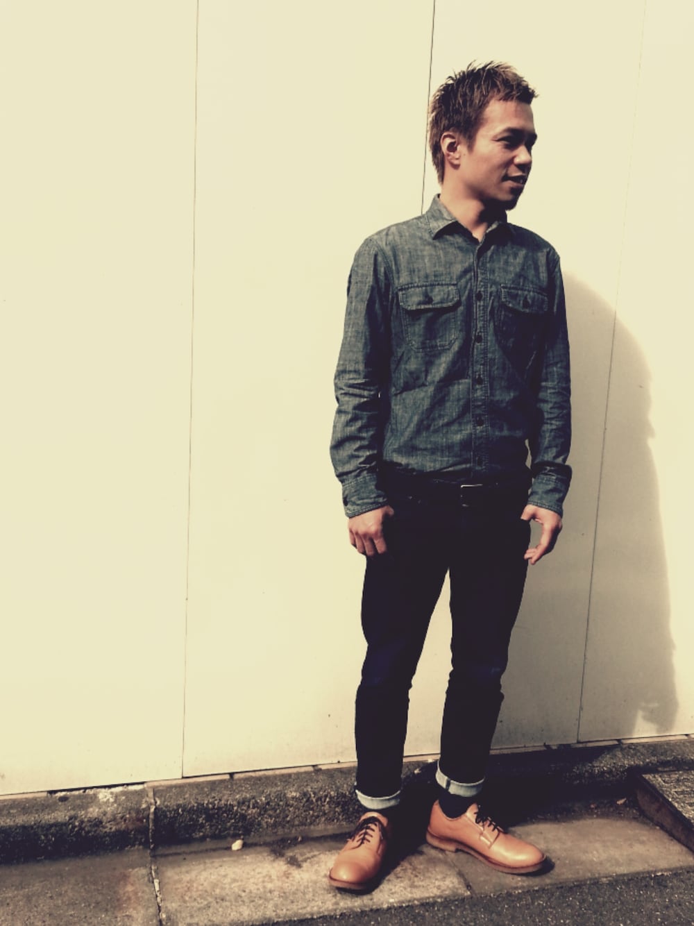 ベージュ系のドレスシューズを着用したメンズの秋コーディネートの1枚目の写真