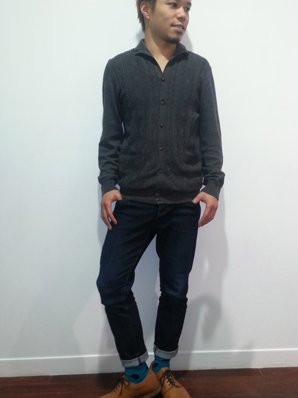 グレー系のカーディガン/ボレロ、ベージュ系のドレスシューズ、グリーン系のソックス/靴下を着用したメンズの秋コーディネートの1枚目の写真