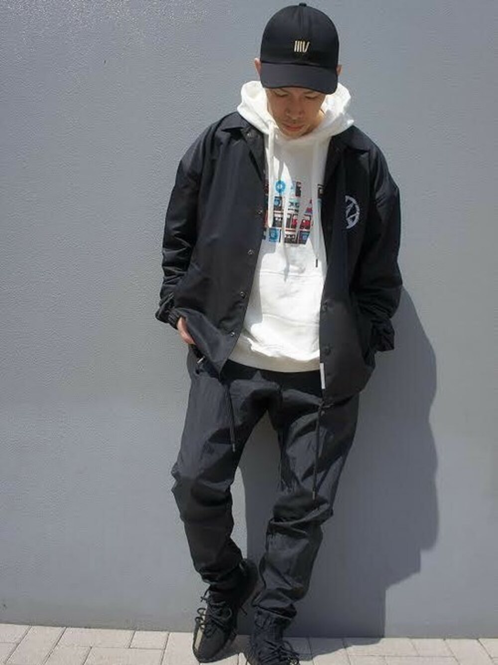 24東京店 湯畑です!!(ゆばた) インパクトのあるIIIVデザインパーカーを軸にモノトーンカラーで統一したコーディネート。 オーバーサイズのコーチジャケットにスポーティーなトラックパンツをチョイス。 キャップはブランドイメージカラーのBLK×GLDを合わせました。