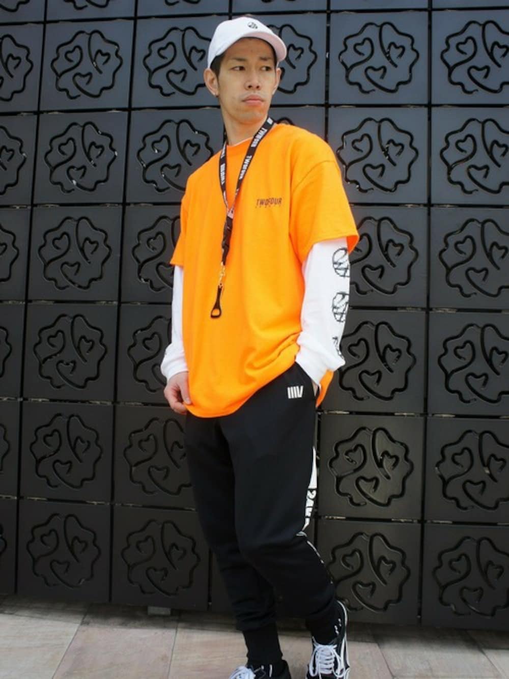 24Karats東京店 湯畑です!! みなさんお元気ですか?★ 桜見ましたか? 今中目黒の目黒川沿い桜満開ですよ!! 是非中目黒に桜を見に来てください!(^^)! 中目黒に来た際は、24Karats東京店にも遊びにきてくださいね!! 僕、湯畑が最高の笑顔でお出迎え致します★★ では、コーディネートのご紹介↓ トレンドのラインジャージパンツに オーバーサイズのTシャツを重ね、袖プリントデザインの入ったロンTをインナーに合わせたコーディネートです。 パンツをBLKにすることでトップスのORGカラーを引き立たせ、キャップはロンTのWHTカラーと合わせ統一感を出しました。 コーディネートのアクセント、ポイントとなるように遊び心あるネックストラップをチョイスしました。