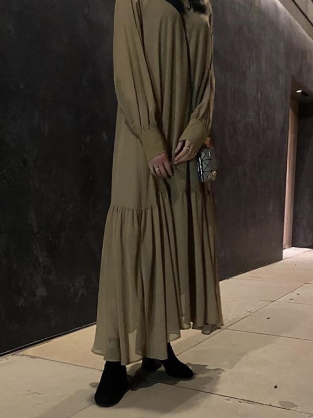カーキで動きのあるワンピース可愛いです🍁 寒いけどギリギリまで着たいな #isseymiyake #isseymiyakebaobao #mm6 #amerivintage#styling #ootd #ootdfashion