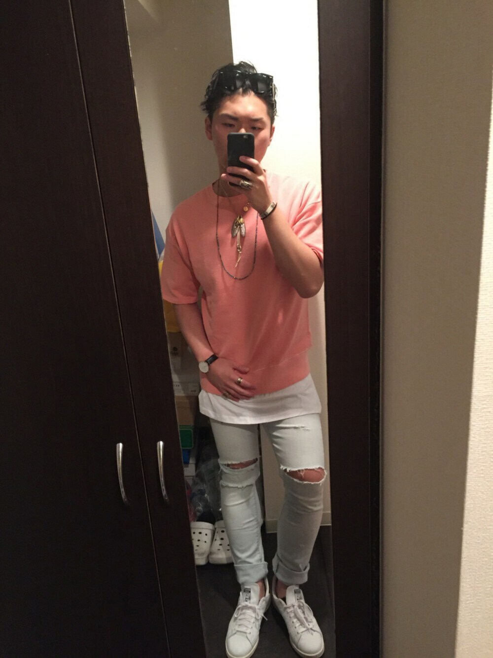 最近、更新続いております!! 今日のコーデのテーマは、『夏先取り』です(笑) 今日は風が強いため、髪型はオールバックにサングラスをのせて固定。 上はピンクのオーバーサイズスウェットで、春らしさもいれつつラフに。 ネックレスはフェザーと、ターコイズ入りビーズネックレスで夏らしさもいれて。 アクセサリーは右手首にはバングルと100均のヘアゴム、薬指にイーグルリング、左手首にはシンプル時計、人差し指にフェザーリング、小指にシューホーンリング。 夏先取りなので小物じゃらつけ。 インナーはロング丈タンクでレイヤード。 下は淡いブルーのクラッシュデニムで、少し辛めに。 靴は白で、爽やかに。 風は強いけど、半袖でもーいけます(笑) サングラスのせはもちろん、登坂さん意識。 昨日は日本酒飲み過ぎて、久々の二日酔い( ; ; ) 居酒屋に傘も忘れたし。 ついてない(笑) では1人寂しくショッピングいってきます。