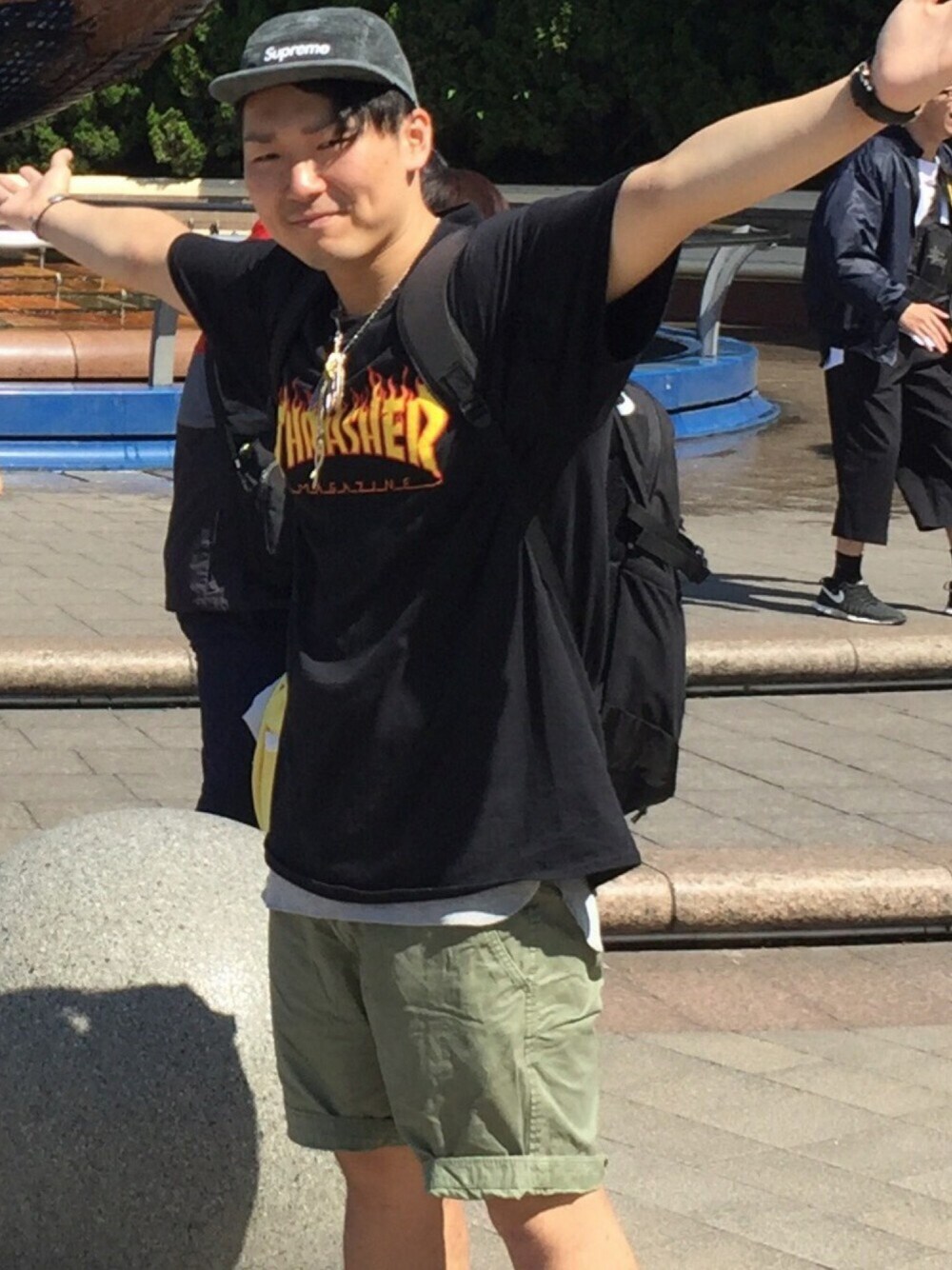 今日から2連休でして、USJまでいってきました(^_−)−☆ 今日は暑くて、暑くてたまらなかったので、夏コーデに仕上げました!! シュプリームのNEW アイテムをお披露目したくべかく、黒系で合わせました。 再販でしたが、念願のバックパック買えて良かったです!! 財布は号泣してますが(笑) かなり、気に入ってますので、ヘビロテします!!( ^ω^ ) インナーはワッフルロング丈タンクを入れてレイヤーど! グローバルワーク、WEGOのロング丈タンクはなかなか安くて使えますね! スラッシャーTもかなりのインパクトで、スタッフさんにもいじられるほどでした(笑) パンツはアメリカンイーグルのハーフチノですが、ポイントは後ろポケットあたりにイーグル刺繍とロールアップして丈みじかめで履いてます!(ビタ男風に(笑)) アメリカンイーグル はリーズナブルで、フェザーアクセやアメカジにはもってこいです(笑) ハリーポッターのアトラクションやったら吐き気に襲われたため、フライングダイナソーはパスしましたヽ(´o`; 皆さん乗られる前は食事を抜くことをお勧めします(笑) 明日は大阪観光して帰ります! いつも、いいね、セーブ、フォローありがとうございます( ^ω^ ) 靴切れてますが、他の人の顔が入るため編集させて頂きました。ご了承ください。 ではまた!