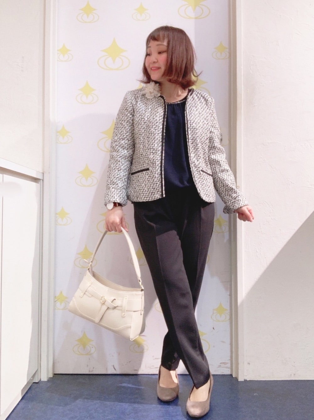 いいね&お気に入り、ご覧頂きありがとうございます◡̈♥︎ 励みになります♡ ツィードジャケットにパンツ合わせ😍 プリーツスカートバージョンは小窓へ。 ブラウスもネイビーで大人な雰囲気に🎵 私はホワイトの方がしっくりきますが、たまにはネイビーも良いなぁ💕と感じました😆 お仕事着にも使えそうです! 最後までご覧頂きありがとうございます◡̈♥︎