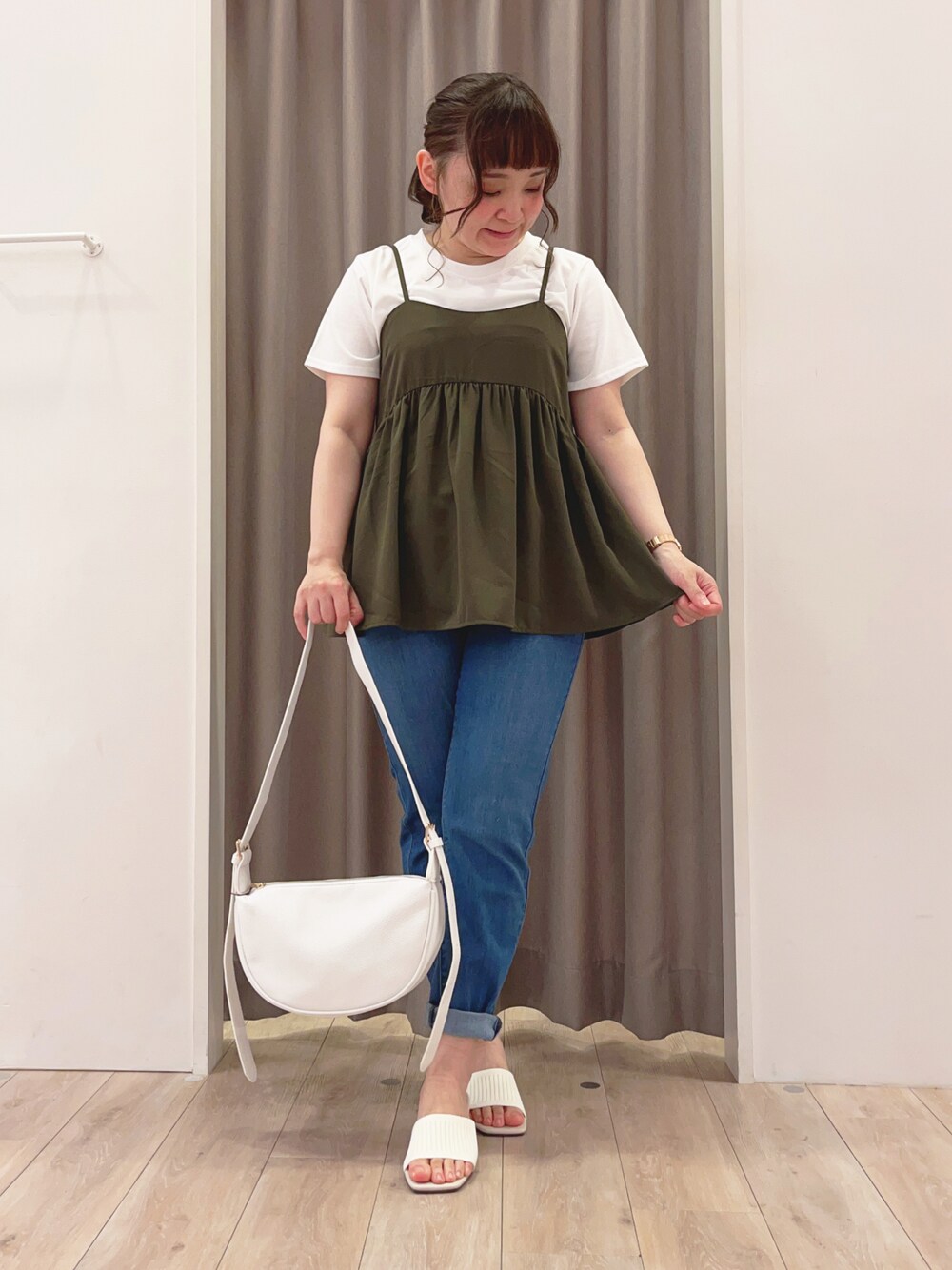 kita(SHOO・LA・RUE)のTシャツ/カットソー「◆【2点セット】ふわっと体型カバー ギャザーペプラムキャミソール×Tシャツ」を使ったコーディネート