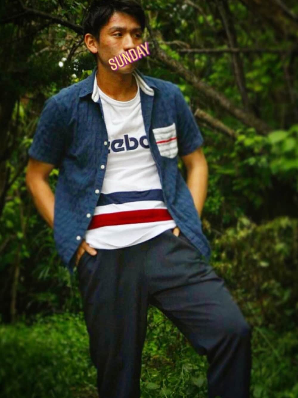 お久しぶりの投稿でーす! この日は雨降っとるにも関わらず傘も差さんと撮影してきました笑笑 紺系統の組み合わせが好きで、中に白を組み合わせるシンプルな着こなしです。まあ雨は嫌いやね!はよ夏になれー🌞🌴