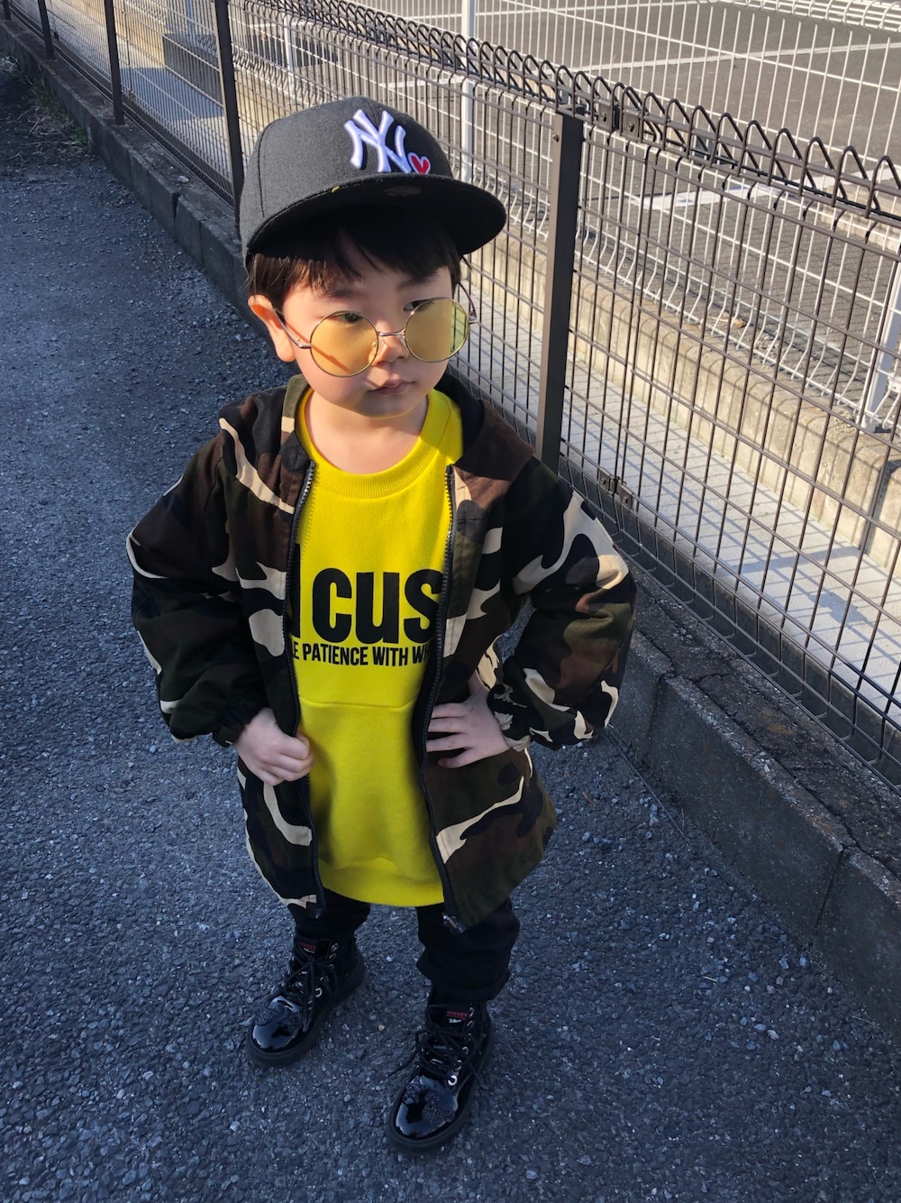 トップスの黄色を目立たせるために、アウターの色は抑え目。でも黒だとつまらないから、迷彩にしました。