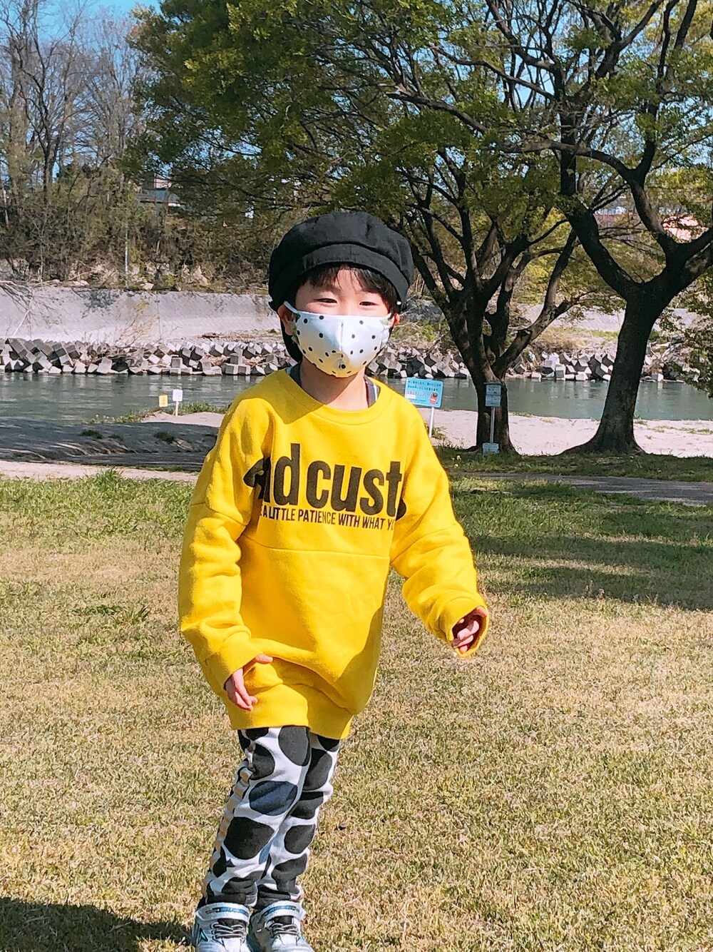 ドットのマスクが映えるようにドットのパンツをコーデ。マスクしててもオシャレはできる😊✨