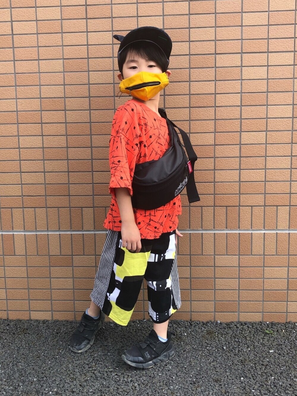 黄色のマスクがドナルドダックみたいで軽く変装。ハロウィン気分🎃 オレンジシャツもパンプキンみたいでしょ😆 マスクとパンツの黄色で色味を調整。