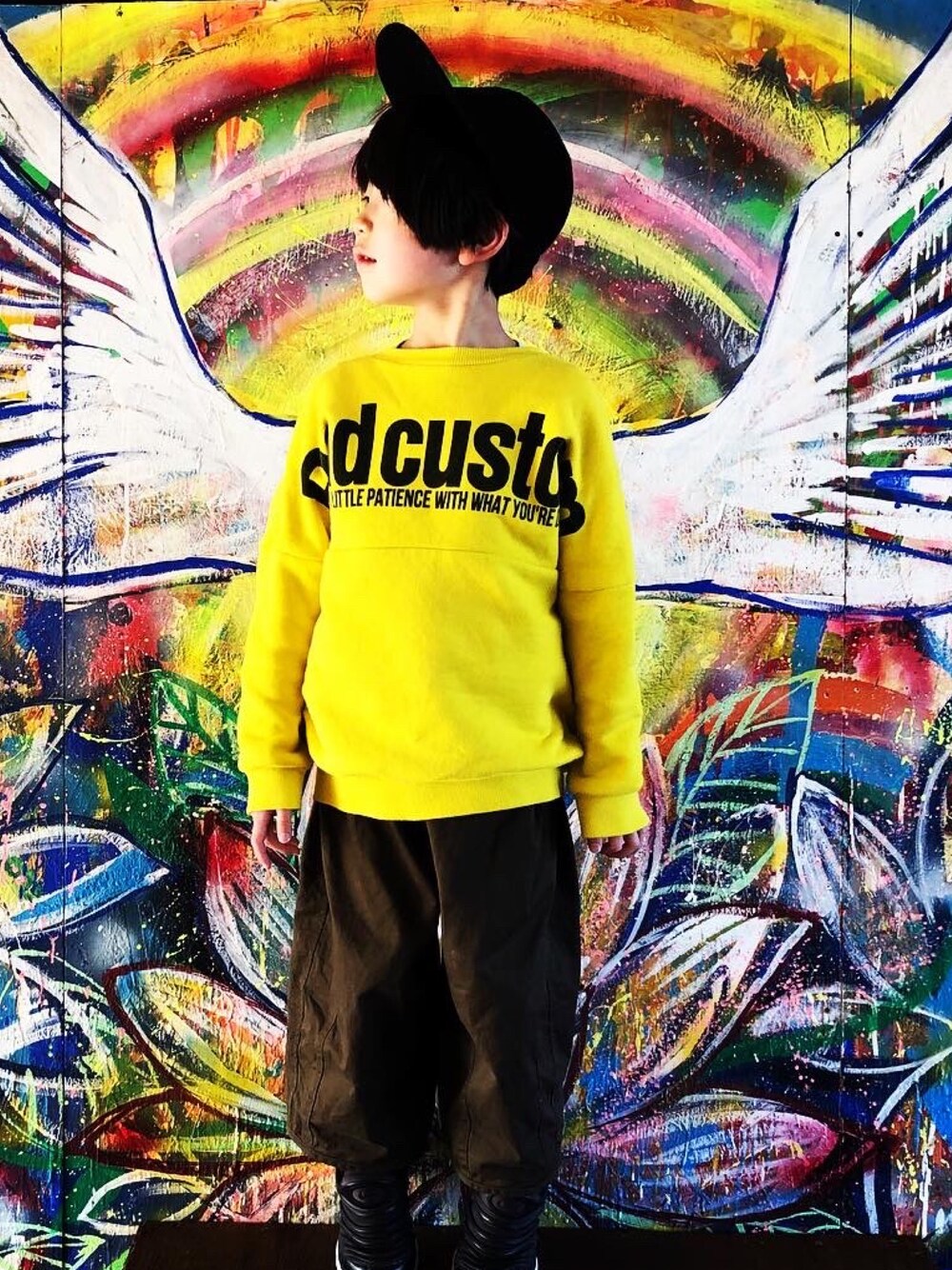 黄色の発色が綺麗なトレーナーにくすみ系のカーキのパンツを合わせてトーンダウン。キャップを被ってバランス調整。