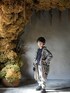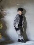 撮影会のスタジオに合わせて、フォークロア調。バッグとパンツは同じ柄で合わせて、さらに大柄なニットカーディガンでインパクト。帽子もニット帽にして統一感。