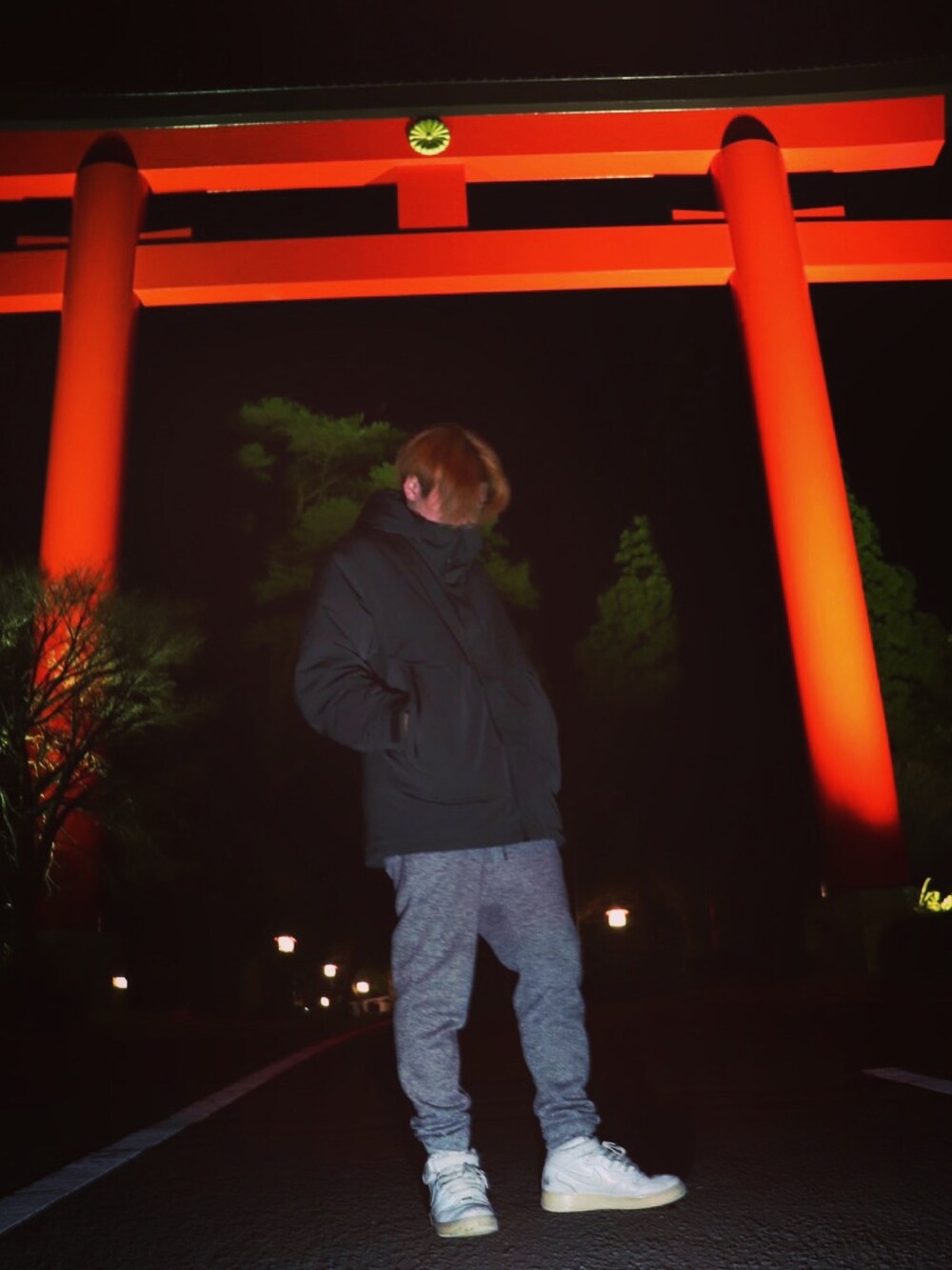 ユニクロ+Jのハイブリッドダウンオーバーサイズパーカーで夜中の寒い神社でいかしてます。