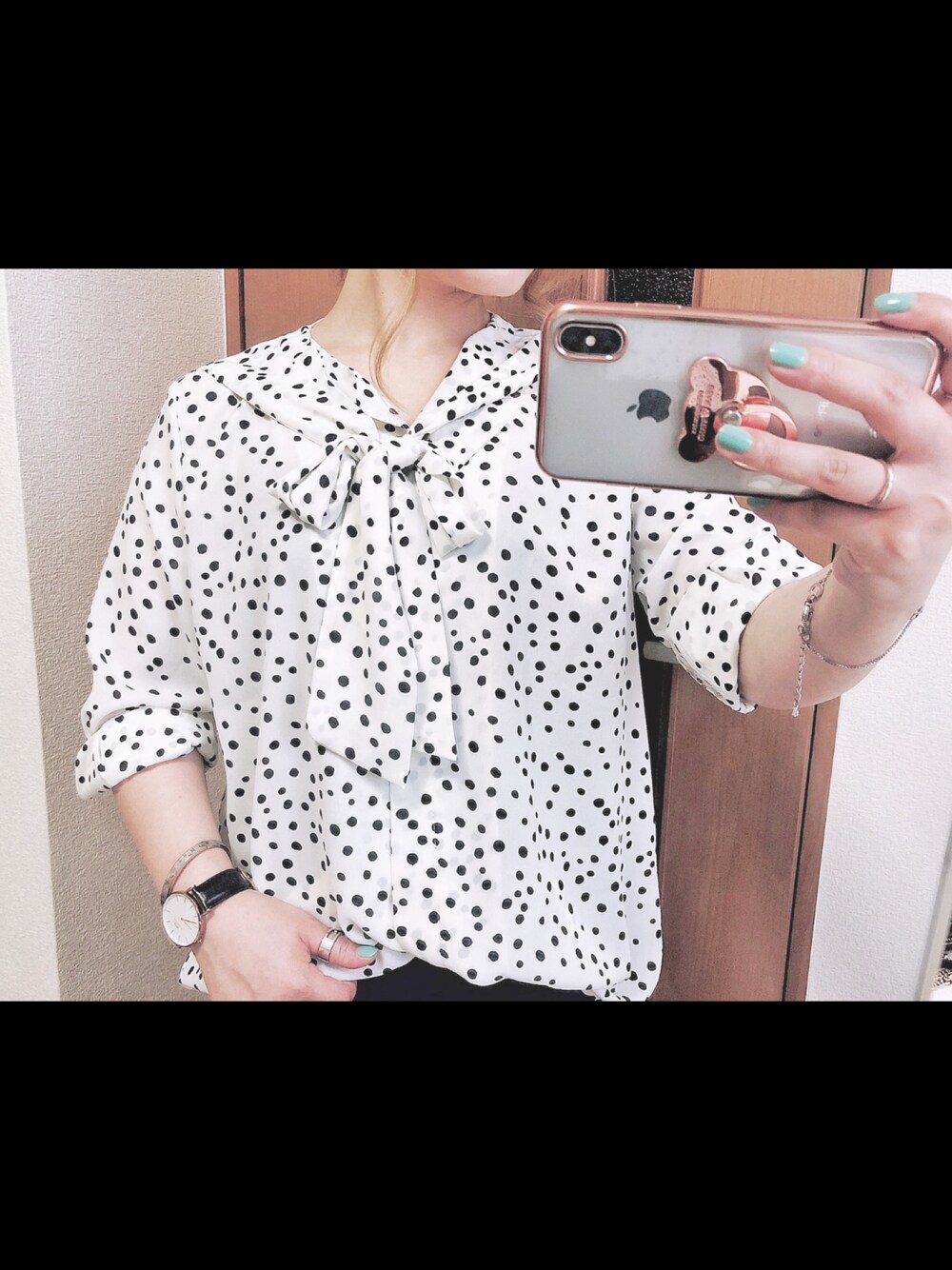 低身長向けブランドcohinaの ドット柄シフォンブラウス○● 胸元のリボンは自由に結べるから ネクタイ風にしてもかわいいかも◎