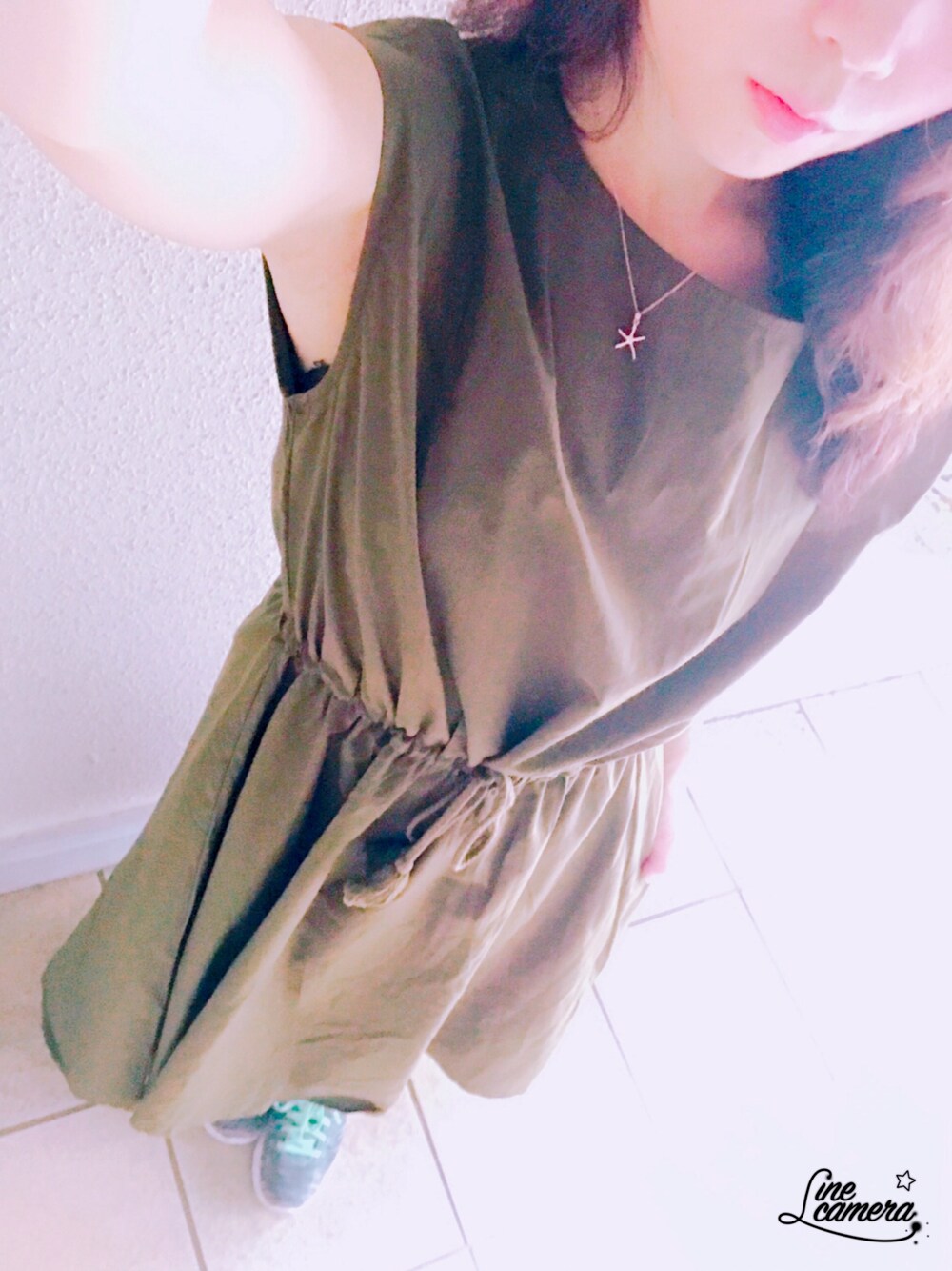 ノースリーブだけどカーキ色で秋。