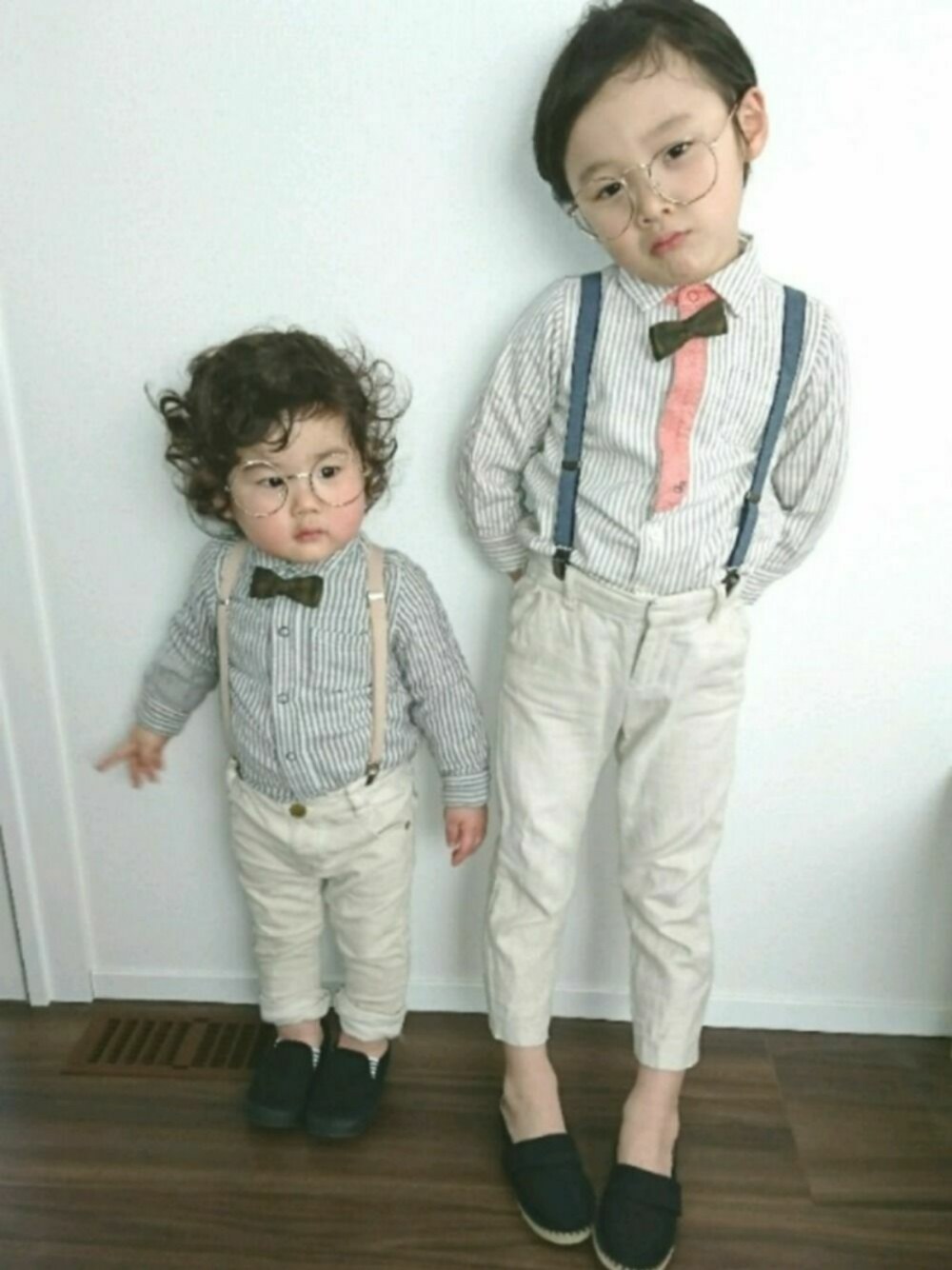 兄弟お揃いのリンクコーデ👶👦💓 seraphのシャツはリバーシブルで使えてとっても便利です✨ サスペンダーやリボンクリップ、メガネなど小物でスタイリッシュな雰囲気に💓 キレイめコーディネートです✨