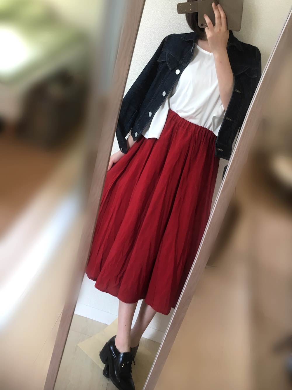 cepoの赤スカートは後ろが少し長めで ふわふわしててお気に入り◎ 白トップスにGジャンでシンプルに! サッシュベルトや帽子があると もっといいな〜!