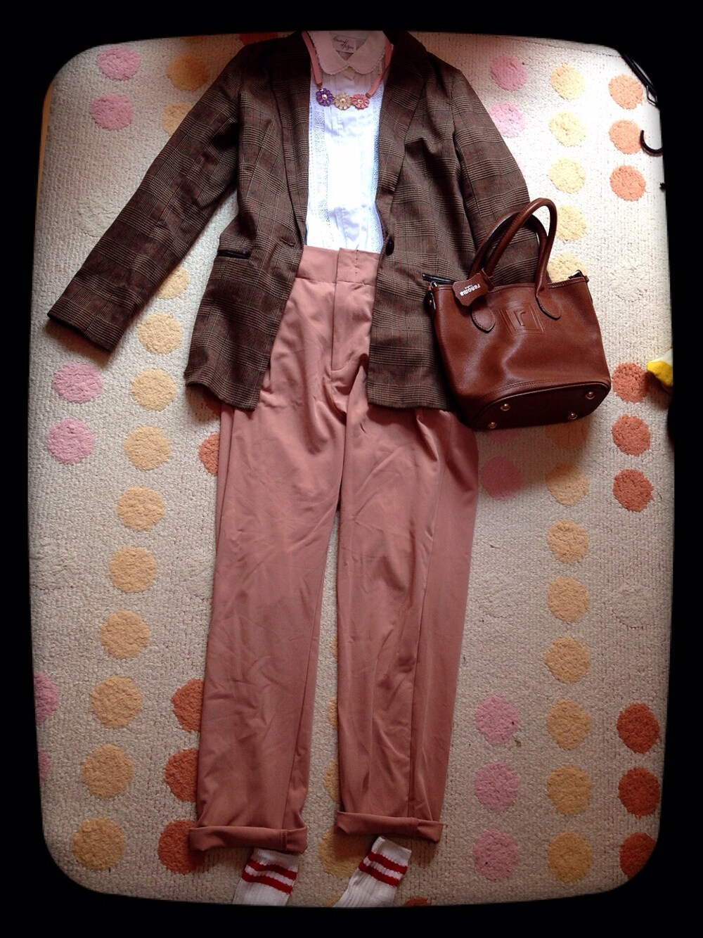 ジャケット INGNI サス付きパンツ GU ブラウス 古着屋 ソックス tutuanna 真っ白いブラウスとお花のネックレスのコンビがお気に入り(^O^)