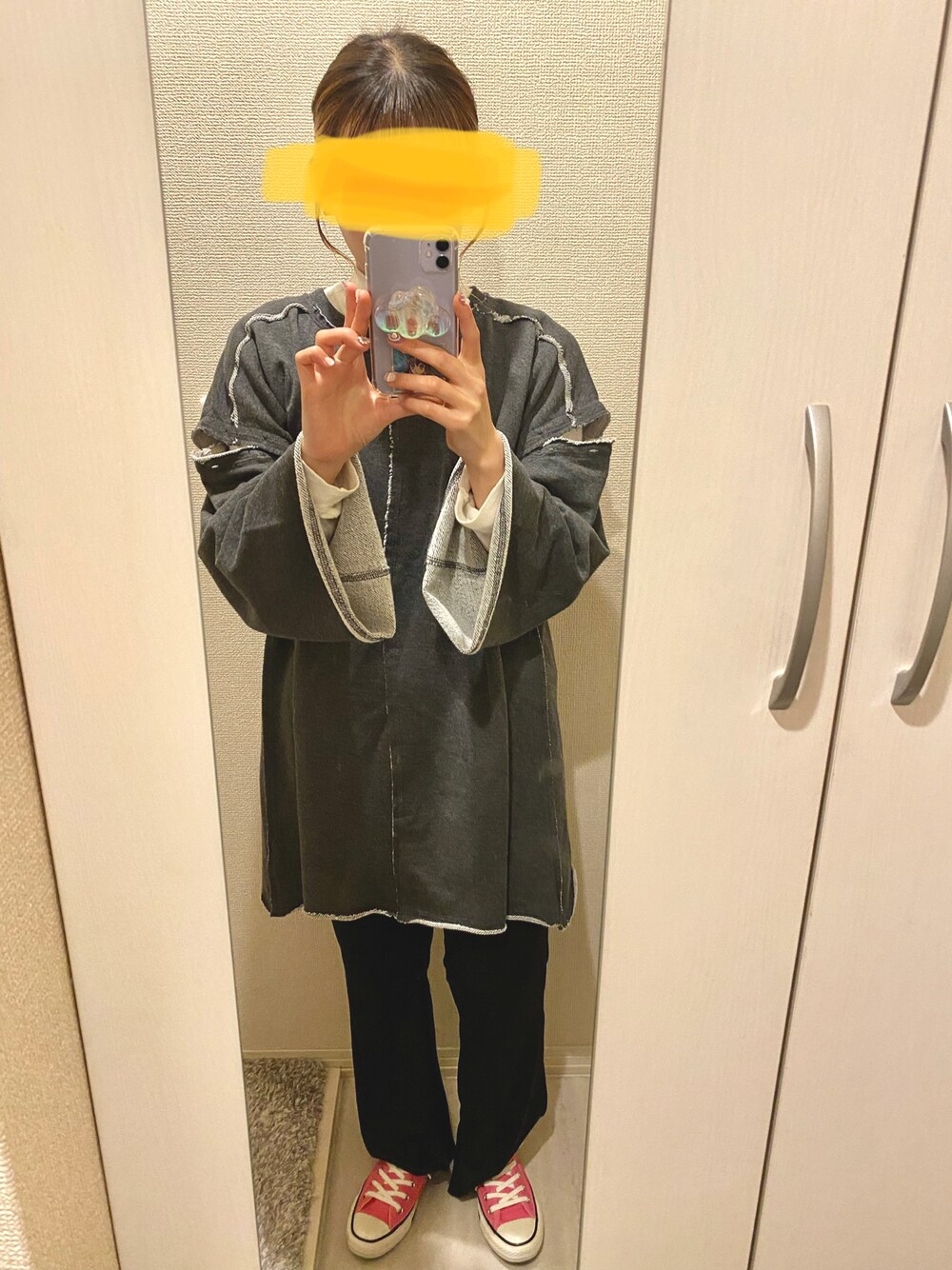 いいね、お気に入り登録ありがとうございます❤️ 出勤コーデ👖 kastaneのカットアウトスウェットを着たかったのでちょっとシックに🙆♀️ 腕のチラ見せ部分はボタンで調整できるのがいいね👍 (ちなみにまだ寒いので、中にシアーのタートルネックを入れてます) ブーツとか履くとカッコいいと思いますが、仕事があるのでスニーカーで👟🍑