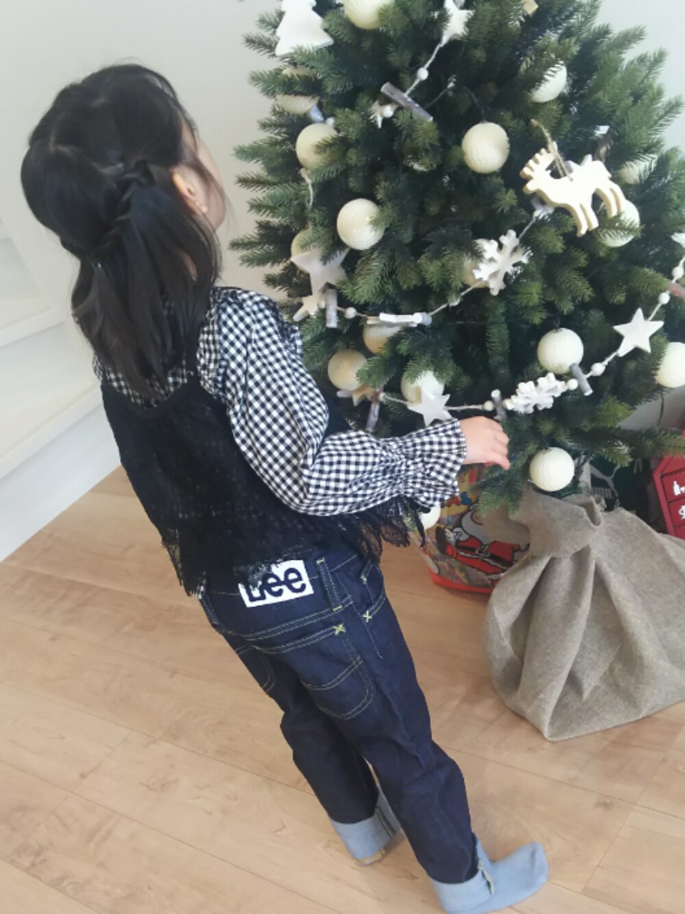 メリクリ🎅💕 本日もX'masメニュー 3日目の今日は無印のビッグバームクーヘンで作ったケーキ🎂です。 切るとフルーツがドバッと出て楽しかった🎵 次女に買ったLeeのデニムが 可愛かったです💕