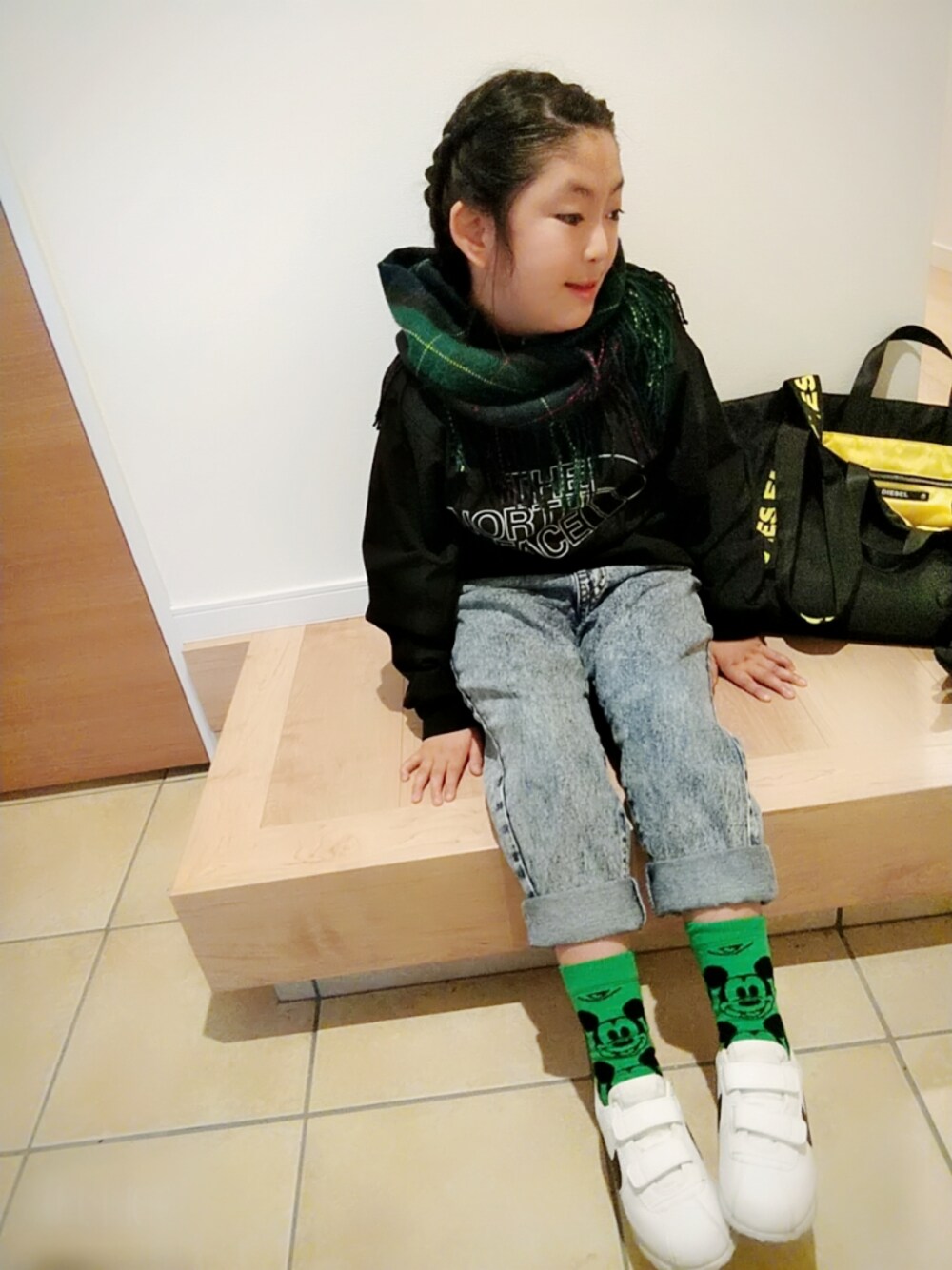 THENORTHFACEの クルーネックウィンブレは 軽くて汚れにくくて イイ感じ( *´艸`)🎵 (だから出掛け先でパスタも気にせず食べられる🍝w) ちょこちょこグリーン💚