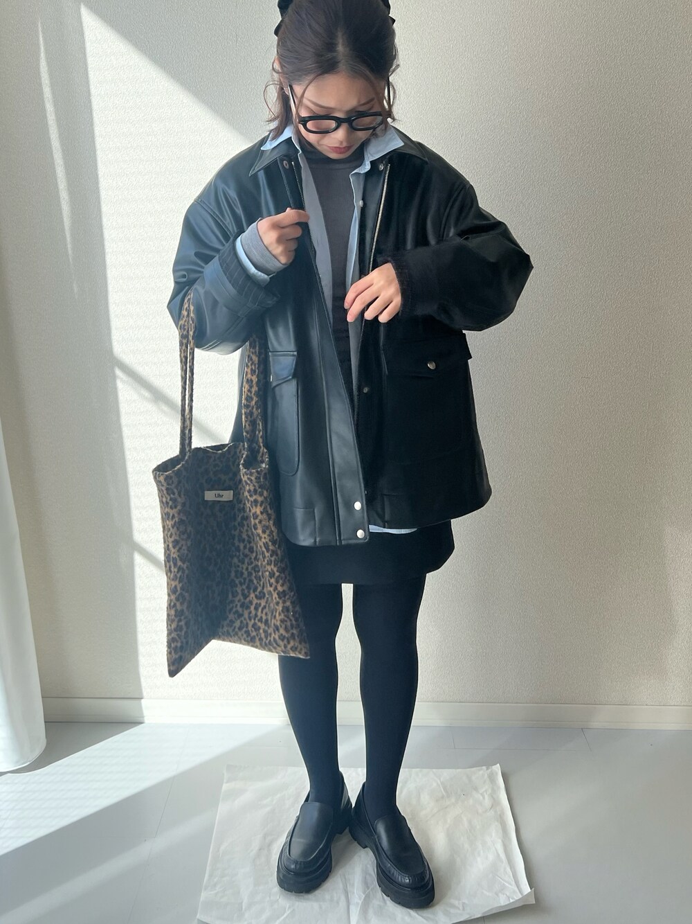 お気に入りのレザージャケットで辛めになりすぎないように、ミニスカートと、リボンで女子っぽく🎀 前髪が伸びてきてめっちゃ邪魔🤣笑 ヒョウ柄のトートバッグはアクセントに🧡 ぽっちゃりもミニスカート履きます!笑