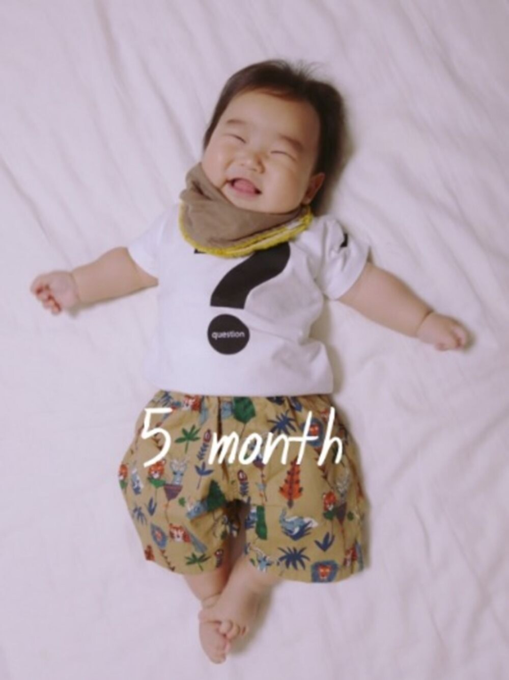 見ていただきありがとうございます✨ 今日で5ヶ月になりました✨ もう5ヶ月なんてあっという間! ついこの前産まれたと思ったのに、ずいぶん大きくなりました。 寝返りもマスターし、あやせばケタケタとよく笑い、表情も発語も豊かになりました✨ ママが見えなくなると、「マンマー!!!」と泣き出すことも。 っていうのはウソで。笑 ただの親バカの耳がそう聞こえさせているだけですが😂 空気のように存在を消していた彼は、今や構ってくれないと泣きわめいて主張し、抜群の存在感を放っています😅 今日はまた予防接種!頑張ってこよう! ocean&groundの動物さんパンツ。 一度通りすぎてからの2度見で、え!?かわいい!!と思って買っちゃいました! パンツを主役にしたいので、トップスは控えめに。←いや、『?』が大分主張してるかも😂 裏は『!』