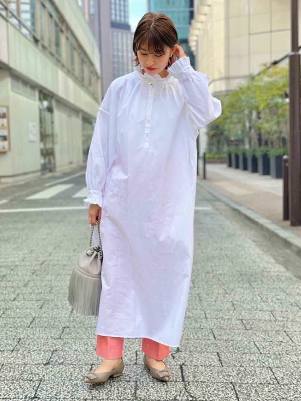 首元と袖にフリルの付いた〈dahlia〉のシャツをポイントにボトムはピンクのパンツを合わせました。フリルとピンクのカラーで可愛らしい印象ですが、パンツを細みの型にし、シューズとバッグの色を落ち着いたグレーで統一することで上品な印象にしました。