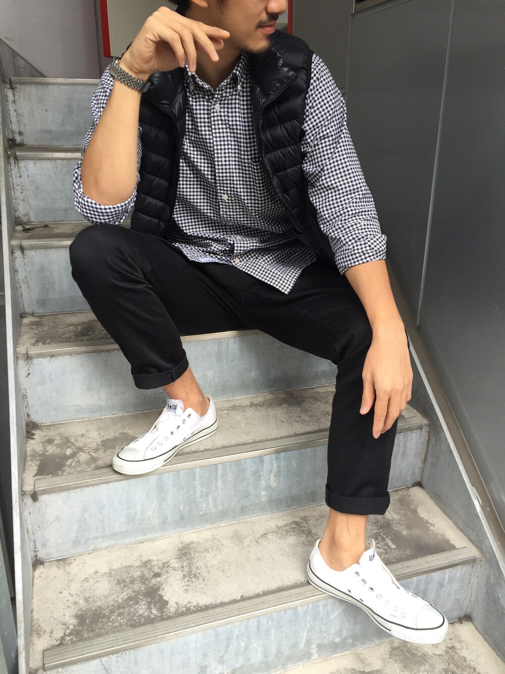 ブラック系のダウンベストを着用したメンズの秋コーディネートの1枚目の写真