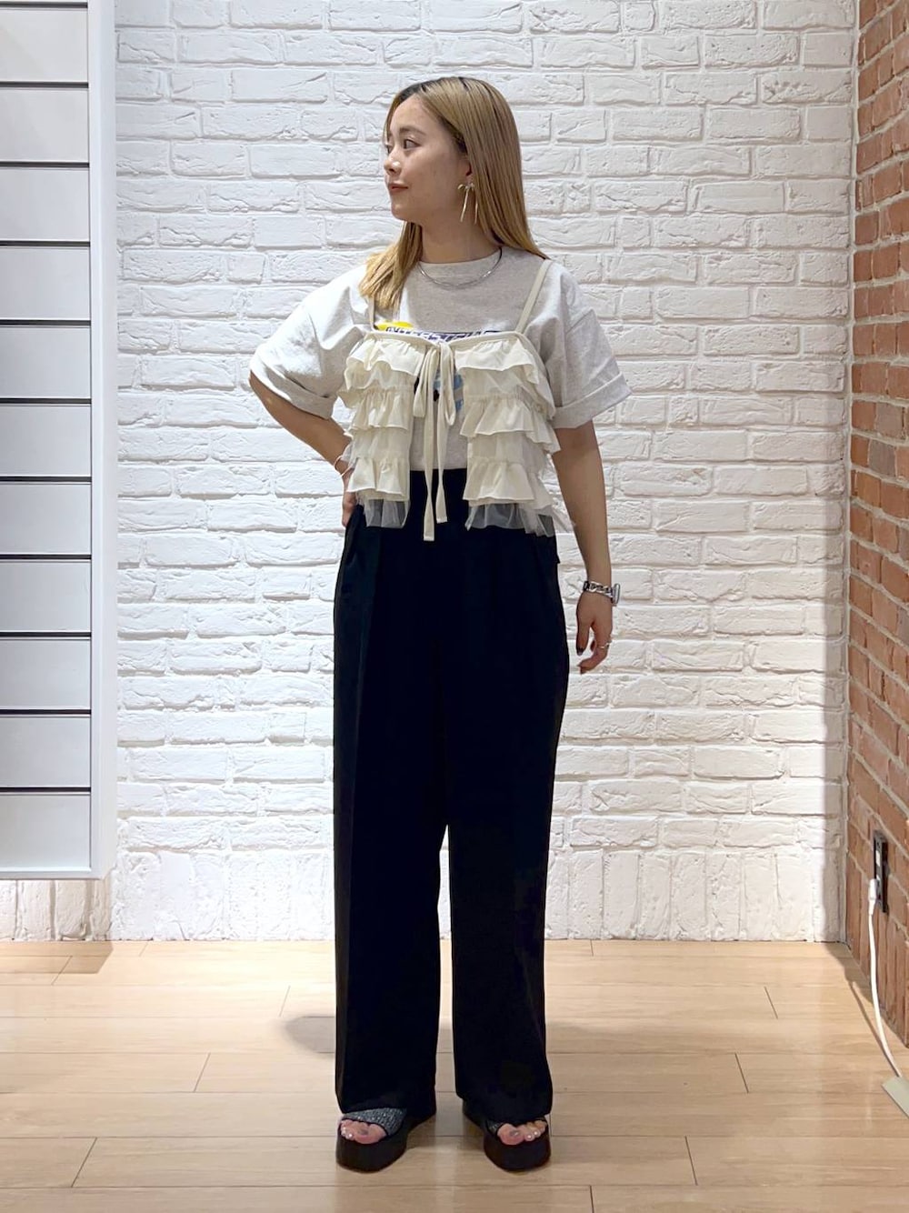 新作アイテム盛り沢山 tシャツとワイドパンツのシンプルコーデに一工夫! ビスチェ合わせると一気にトレンドコーデに てろっとした肌触りのパンツで形も綺麗! ウエストにタック入ってるのですっきり見えします◎ 160cmだとMでOK