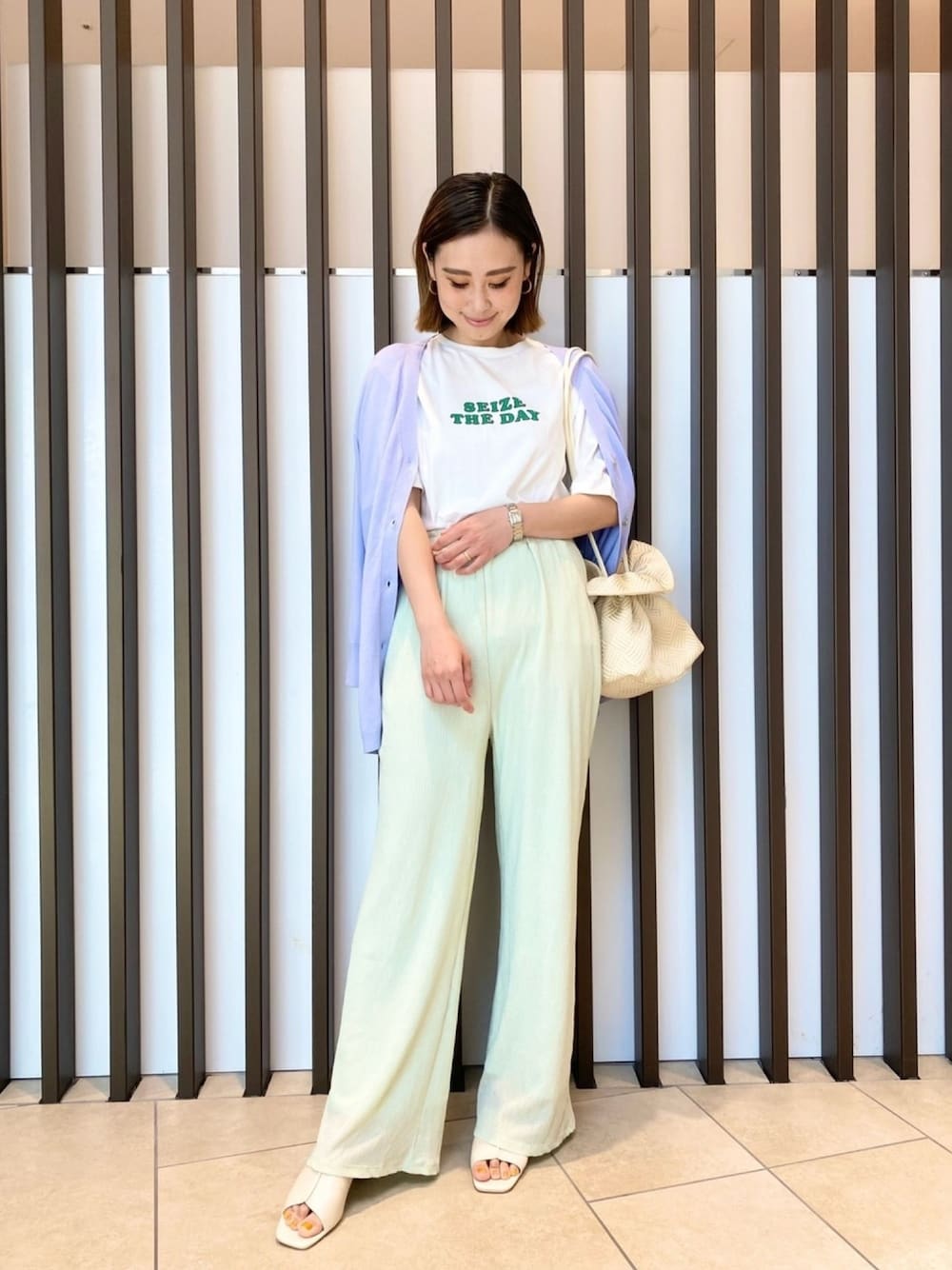涼しげな春夏カラーのコーディネートのご紹介です♡ 毎シーズン買い足すアイテムといえば、Tシャツ。 大人もたまにはプリントを着たい! ヴィンテージライクな文字プリントが大人なプリントTシャツはいかがですか? 白地のボディにグリーンの文字が映えますね♪ またボトムスにはリラックス感満載の楊柳イージーパンツを。 優しいミントカラーがとっても可愛い!! 個人的にかなりツボです♡ またミントとの相性が抜群のサックスカラーのカーディガンを羽織れば、春夏カラーのコーディネートの完成!!! コーディネート自体がとてもシンプルでも、カラーで遊ぶとお洒落感も出ますよね◎