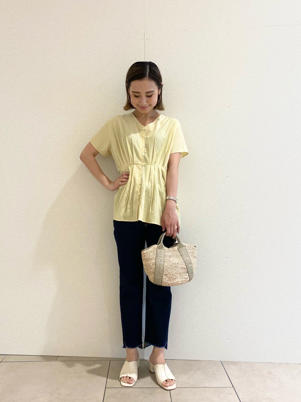 セール商品を使ったおすすめのコーディネート♡ レモンイエローが可愛いこちらのブラウス。 Vネックで首元がすっきりとした印象で、涼しげですね♪ サニーレーベルのオリジナルのデニム。 なかなかセールにはならないので、とってもおすすめ。 履き心地、シルエット共に◎ 程よいフレアに、足首がちらっと出るカットオフデザインで、美脚効果ありです。