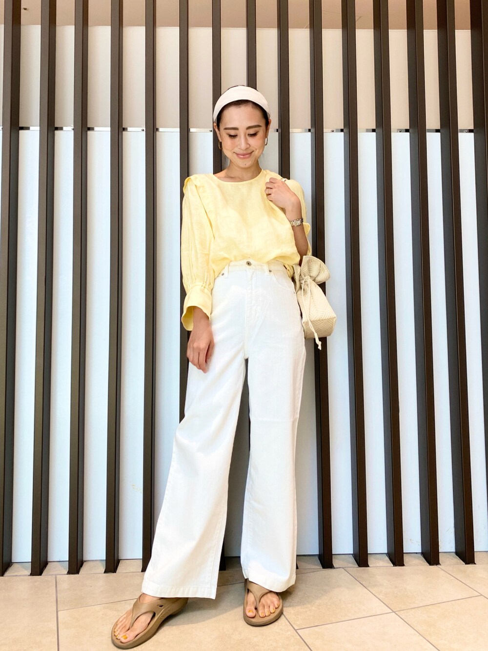 リネンブラウスとホワイトデニムで夏らしいカラーのコーディネート♡ 通気性の良いリネンブラウスは、夏にもってこいの一枚。 タックスリーブデザインで、腕のラインを綺麗に隠してくれるのが嬉しい♡ 袖まくりをして、ちょうど肘のラインまでもってくると、ふわっとしたボリュームがとても可愛いです。 おすすめは夏らしい爽やかなイエロー♪ またワイドパンツは、とにかくラインが綺麗でとてもおすすめ!!! 23から26までと、サイズ展開も豊富です。 是非お試しください♪