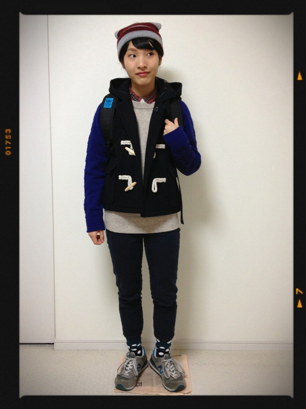 ダッフルベスト BEAMS BOY セーター BEAMS BOY シャツ BEAMS BOY パンツ UNIQLO スニーカー new balance 574 ニット帽 BEAMS BOY リュック adidas originals 毎日寒いですね;_; 家では極力誰かの隣りにひっついて、 ぬくもりをもらっています;_;