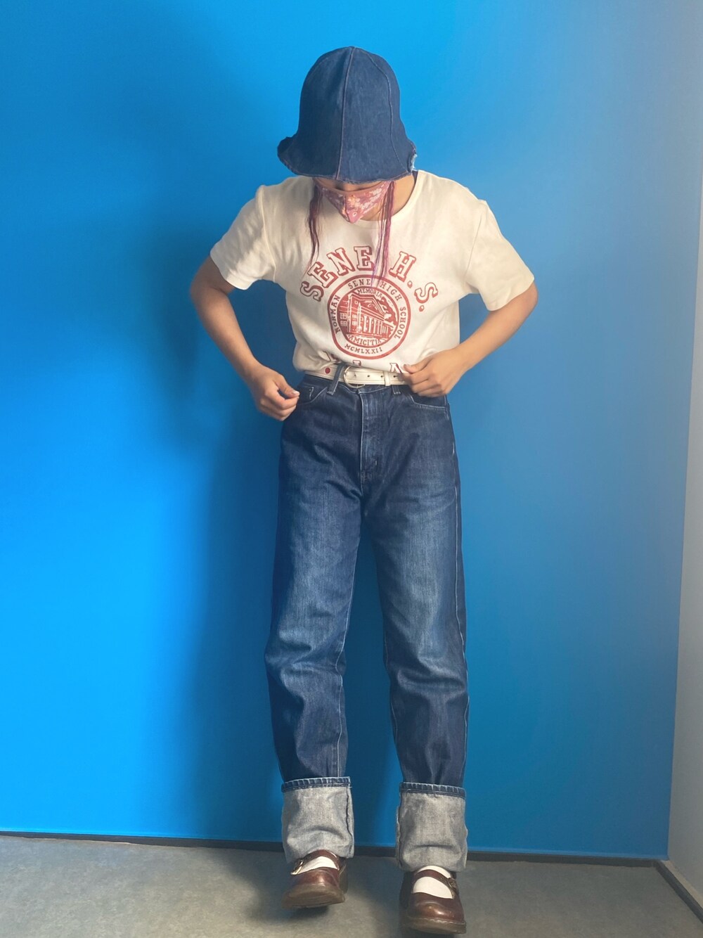 Tシャツ✖️デニムが可愛いよね、。 ポイントは 帽子のデニムと、ベルトが赤の水玉¥100 帽子が確か¥2500で帽子が1番高いコーデ^_^