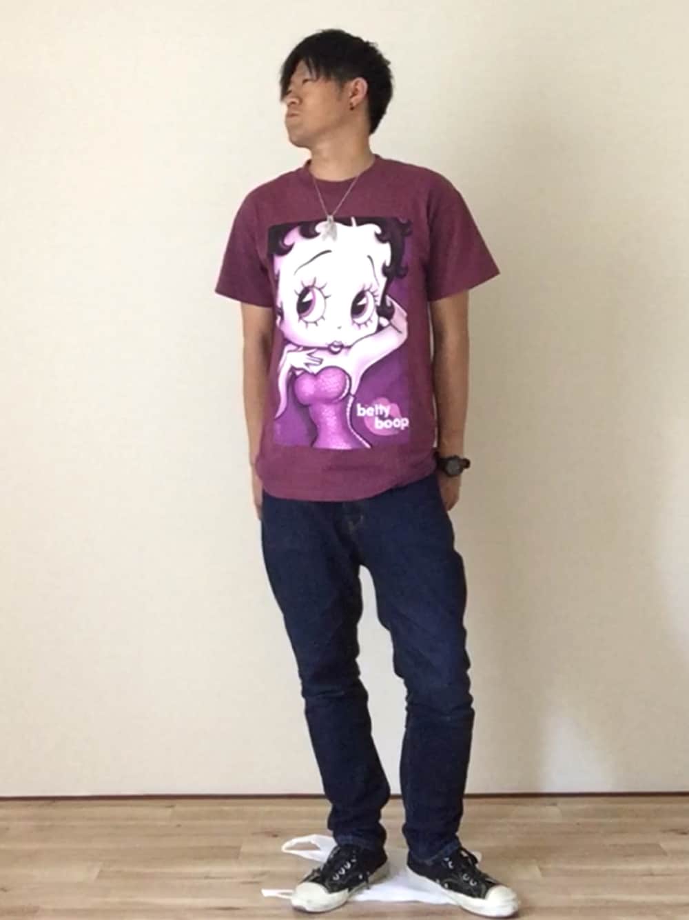 皆さんおはようございます^ ^ いつもご覧頂きいいねやお気に入りやフォローありがとうございます☺️ 今日はストリート古着MIXコーデになります☆ トップスは古着屋で一目惚れしたベティちゃんの紫のTシャツです、ただプリントが大きく、着るのを躊躇いました。 ですが、ファッションは自由なので、堂々と着たいと思います。 パンツは最近登場しているエクストララージのテーパードデニムを履いて、足元は履き潰しているプロケッズのハイカットスニーカーです。