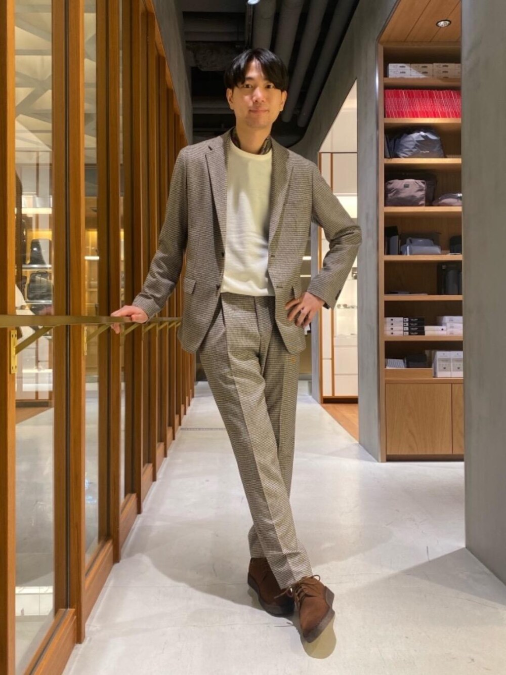 ブラウンの千鳥格子が絶妙なセットアップにボリュームのあるスエードシューズを合わせました。カジュアル感ある着こなしこそ、品の良さを意識しています。
