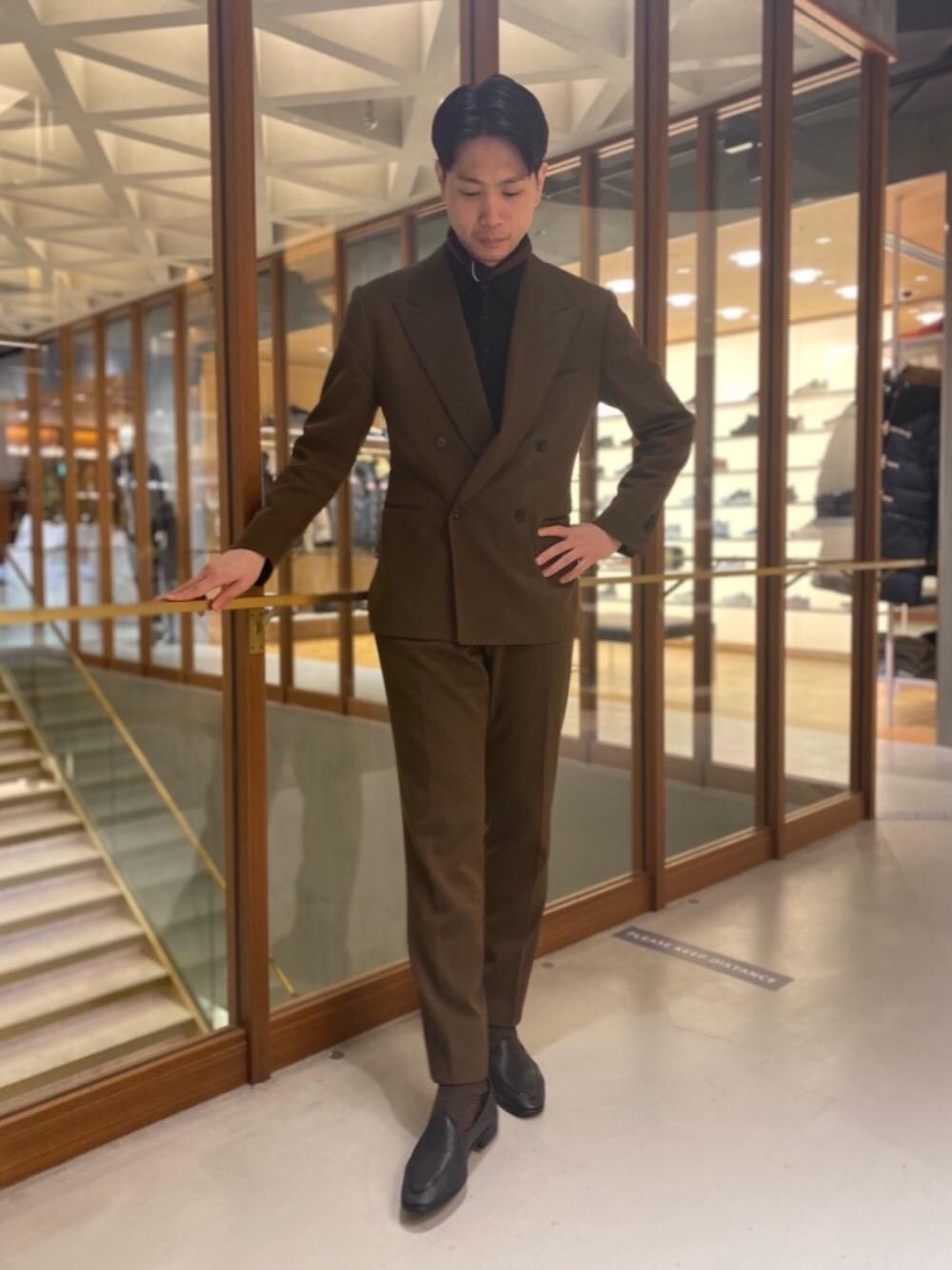 ニットポロにスカーフを合わせ、4Bダブルのスーツをドレスダウンしました。黒と茶で色数を絞っている点とメッシュベルトやソックスのチョイスがポイントです。
