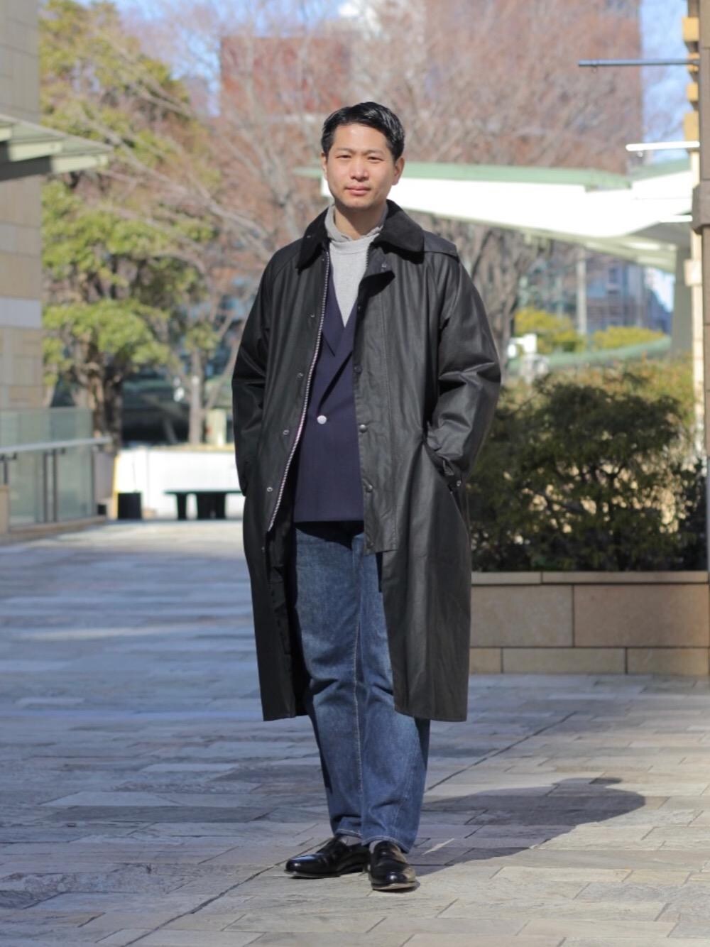 バブアーのオイルドコートにネイビーブレザー、デニムにローファーと普遍的なコーディネートですが、程良くゆとりあるコートのサイズ感、ブレザーはメタルの四つボタン、黒色の挿し方等々、トラッドなアイテムが現代的に見えるように意識しております。