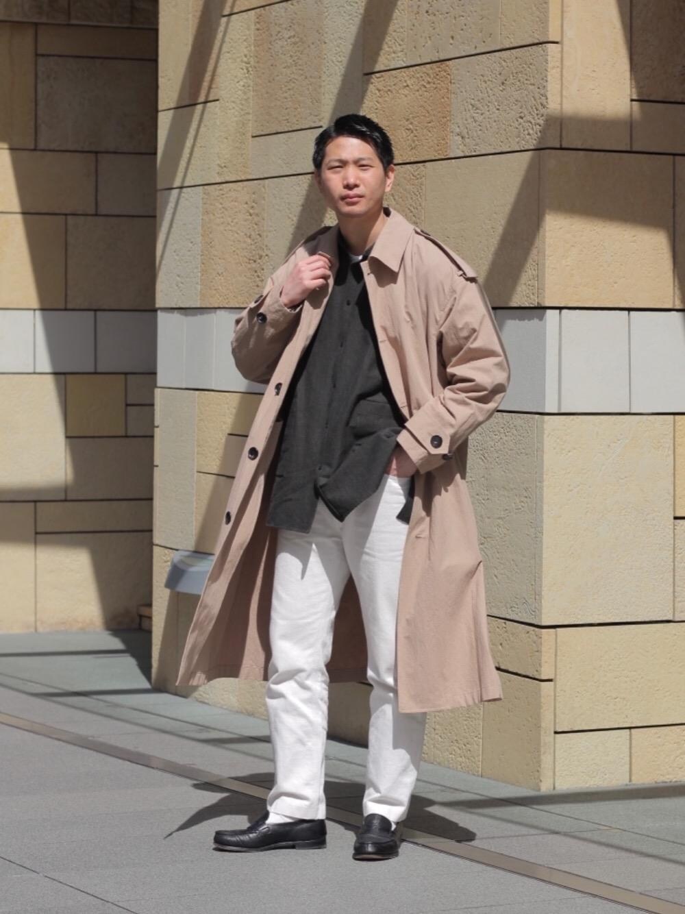 お勧めの春アウターをメインにコーディネートしました。ボリュームのあるシルエットが動きや風でなびく様に心惹かれます。カジュアルなスタイルの足元にはローファーを合わせて、全体のバランスを取っております。