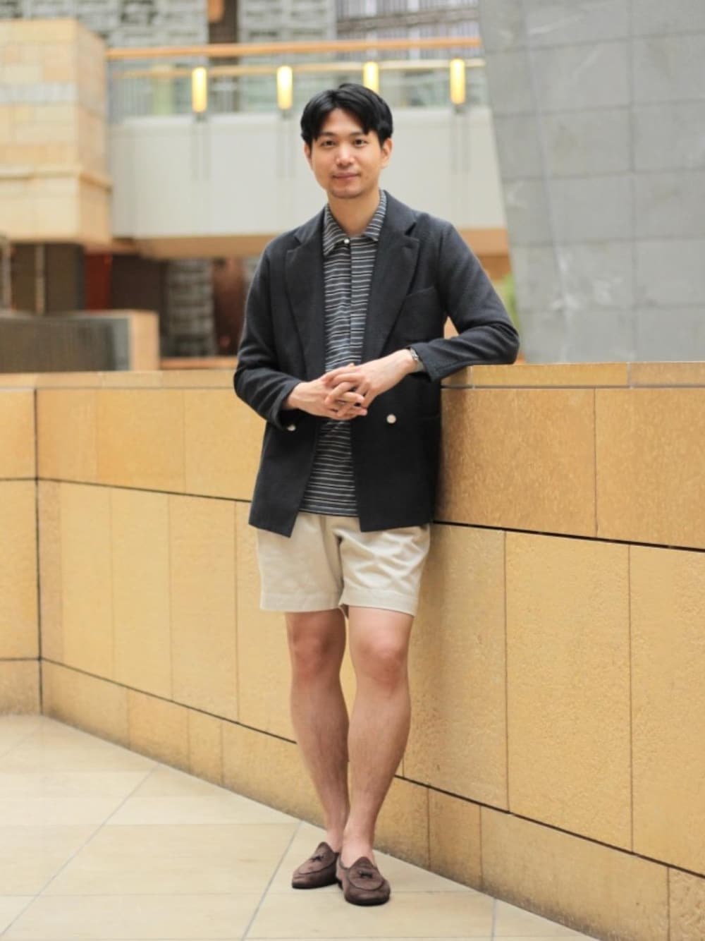 パイルポロシャツとデニムショーツを軸にコーディネートしました。カジュアルなアイテムに対して、リラックス感あるジャケットと品の良いベルジャンシューズで全体のバランスを取っております。カジュアルアップさせる着こなしもユナイテッドアローズらしいと思います。この夏もお勧め致します。