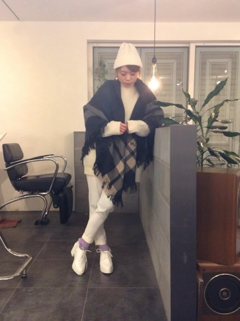 ホワイト系のニット/セーターを着用したレディースの冬コーディネートの1枚目の写真