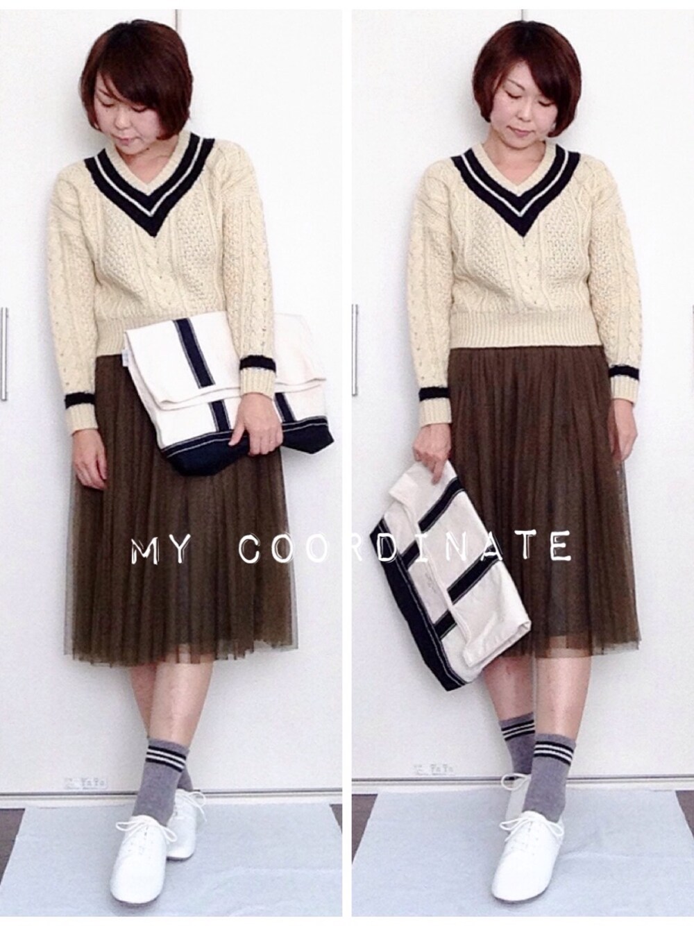 IKUmamaのニット/セーター「Ray BEAMS / ライン入り ケーブル Vネックニット」を使ったコーディネート
