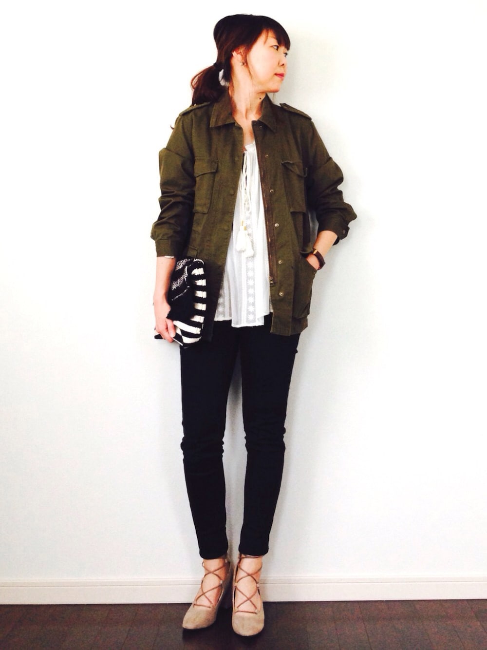 甘辛ミックス❤️ 自分的に好きなコーデ❤️ 最近ワイドパンツばかりだったので、スキニー。 ブラックスキニーはやっぱり使えますね。 暖かくなってきたので、そろそろダメージデニム解禁しようかな? 見ていただきありがとうございます😊