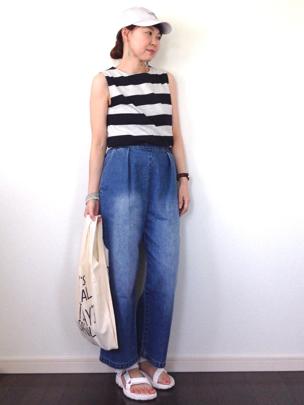 こんばんは😊 今日は蒸し暑かったですね! このコーデから、ボーダーノースリーブカットソーを出品しました。 興味ある方は覗いてみて下さい! よろしくお願いします!