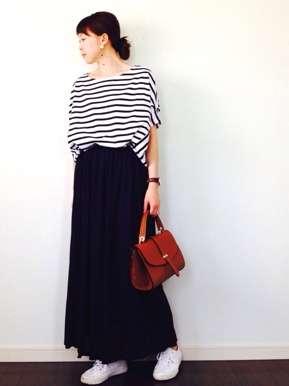 今日も雨ですね〜😂 ムシムシしてるから体がダルい😂 また、マキシスカート! 見にくいけどプリーツになってます! カジュアルコーデにレザーバックを合わせてみました😊
